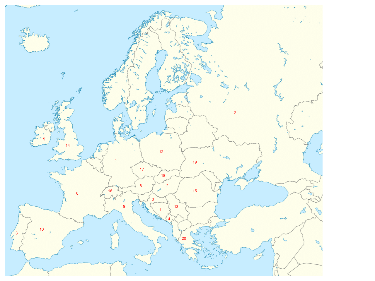 Help Laura and James learn more about countries in Europe. Follow the numbers on the map and choose the correct name of the country from the drop-down menu. If you have difficulties, check the help button (“i”) next to each drop-down menu.