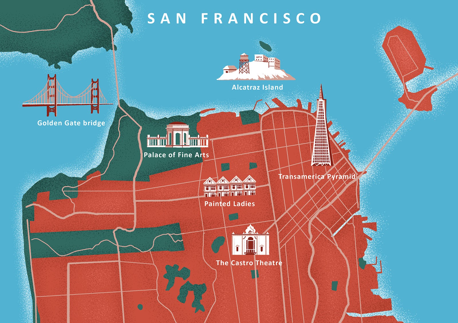 Look at the map and tell us more about Laura’s city. Imagine that you are Laura. Tell us what we need to visit there and why, where those tourist attractions are located, which areas of San Francisco are a must-see and where they are located in comparison to where Laura lives. Every location that you mention should be from Laura's perspective.