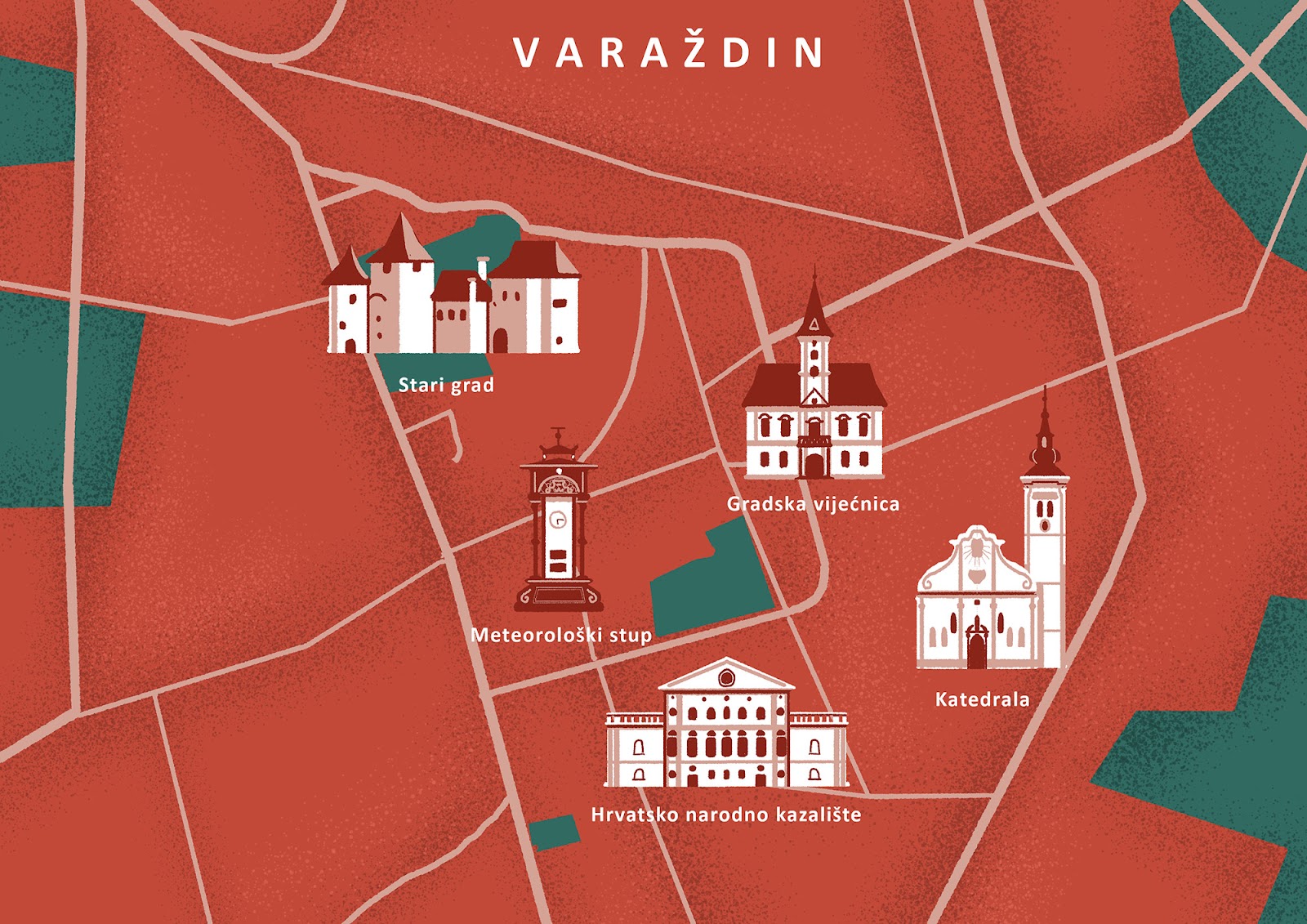 Now that you have all locations. Imagine that you are on the main square in Varaždin – Trg kralja Tomislava. Where are all the places of interest located in the city from the perspective of being on the main square? You can also use Google maps for easier orientation. An example (not from the dialogue) is given for you.
