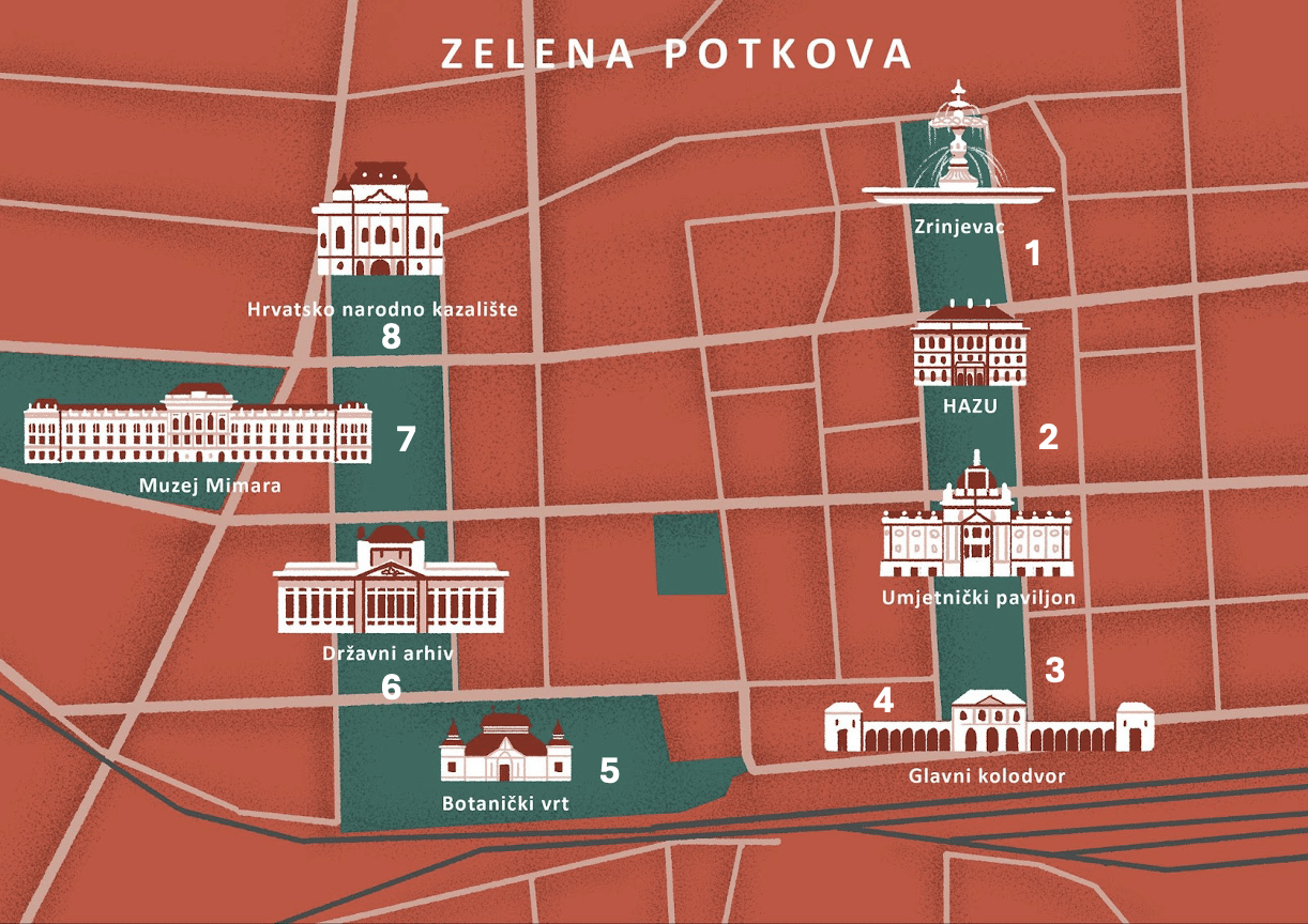 “The Lenuci Horseshoe or the Green Horseshoe is a U-shaped system of city squares with parks in downtown [...] Zagreb. The horseshoe was conceived in 1882 by Croatian urbanist Milan Lenuci. The parks were designed between 1883 and 1887, at a time when today's Donji grad formed the southern outskirts of Zagreb.” Source