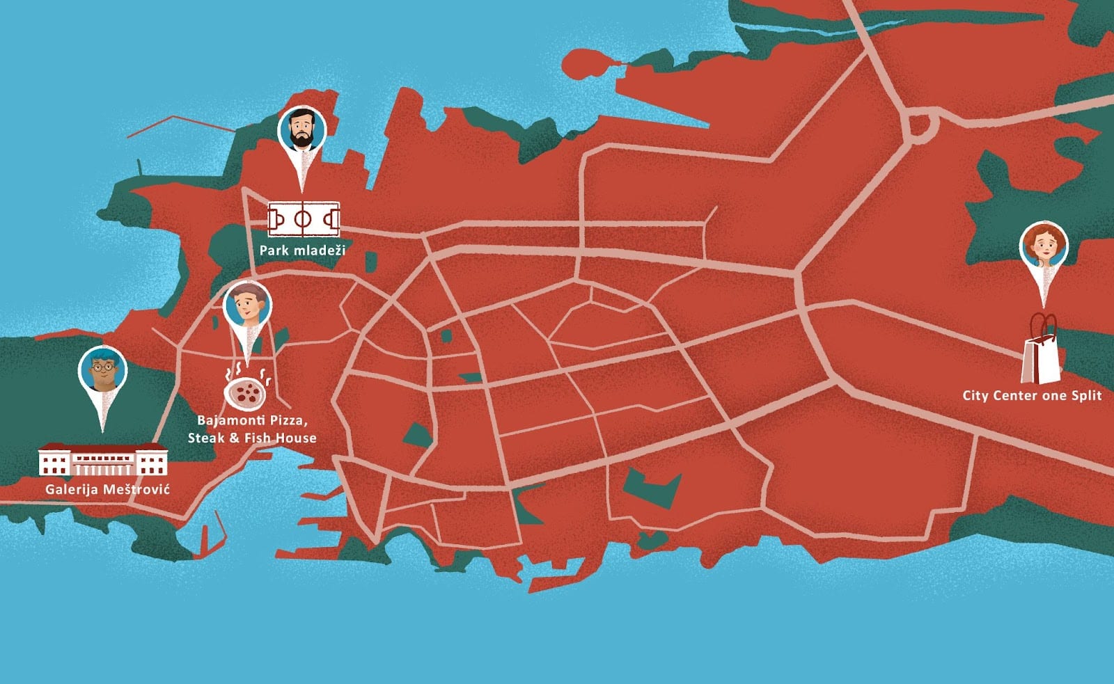 👥 Look at the map. Each of our students in Split is in a specific location. Your task is to search online for all four locations, associate each picture below with location, write the address, which student is at which specific location, and provide your reason why each of them is at that specific location. The reason why they are there is just your personal opinion, based on what you have learned about James, Ines, Matija, and Luka.