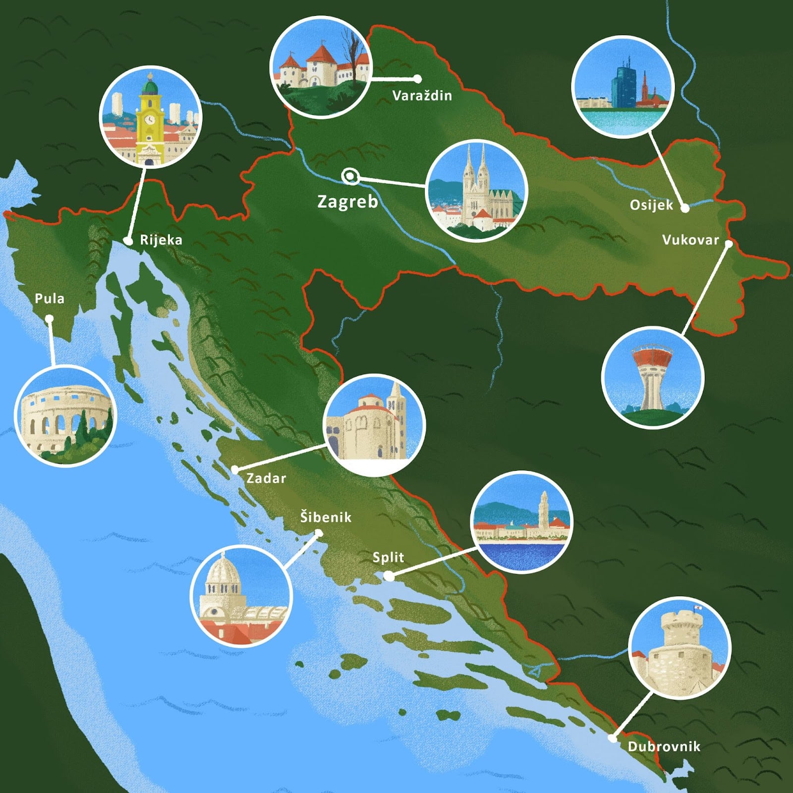 1 | Since we already talked about Zagreb and Split, pick any other city on the map and search online for what one should visit if there. |