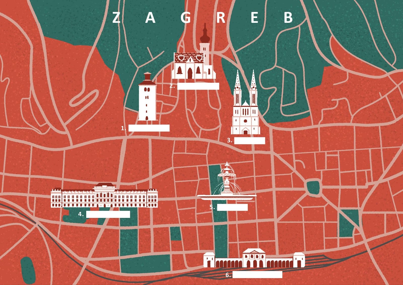 👥 Rad u paru [Pair-work]. Handout. Each of you will receive a map of Zagreb. Talk with your classmate and complete the picture you were given by asking each other for the missing information. Place these items / locations of interest on the map where they belong. Pay attention to the given images on the map. Write down the name of the location as well (for example: park Zrinjevac).