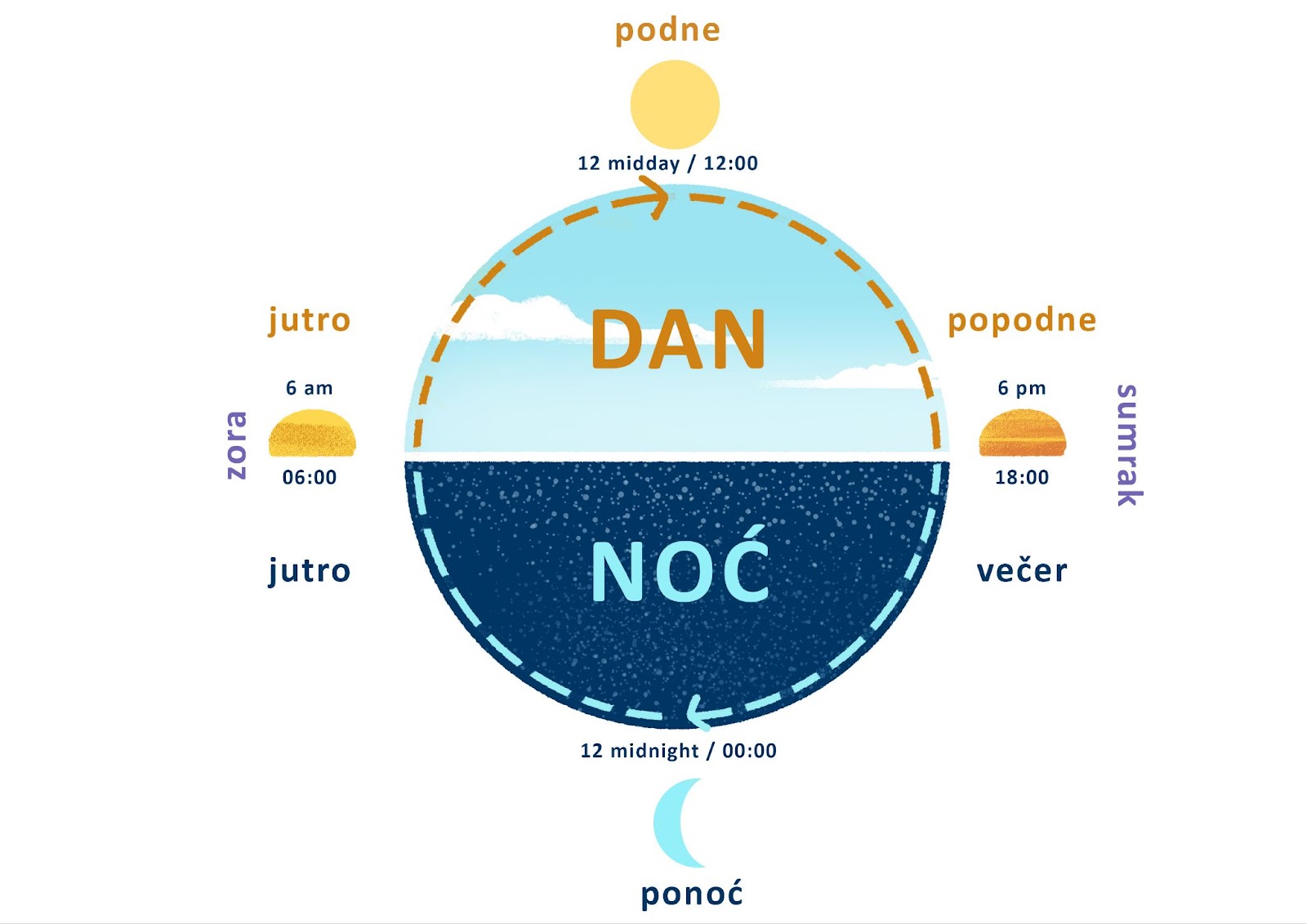 As you can see, Croatian uses a 24-hour system. Thus, to differentiate the morning and evening time, you can say: