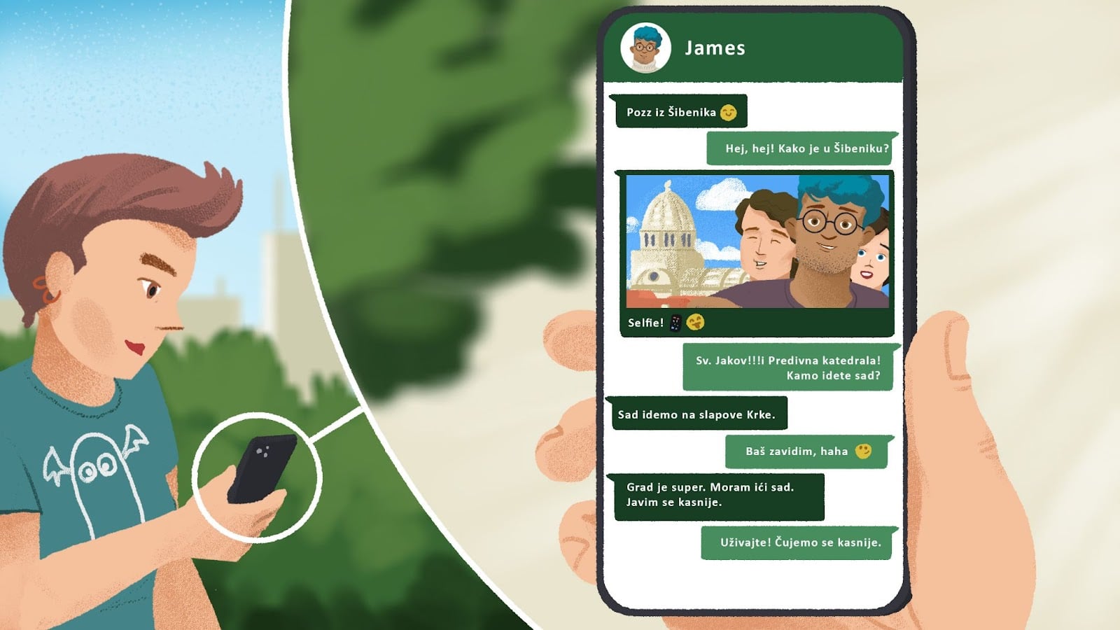 🔊Listen to the dialogue between Matija and James. They are talking about James' recent trip to Šibenik and they are also making plans for the near future.