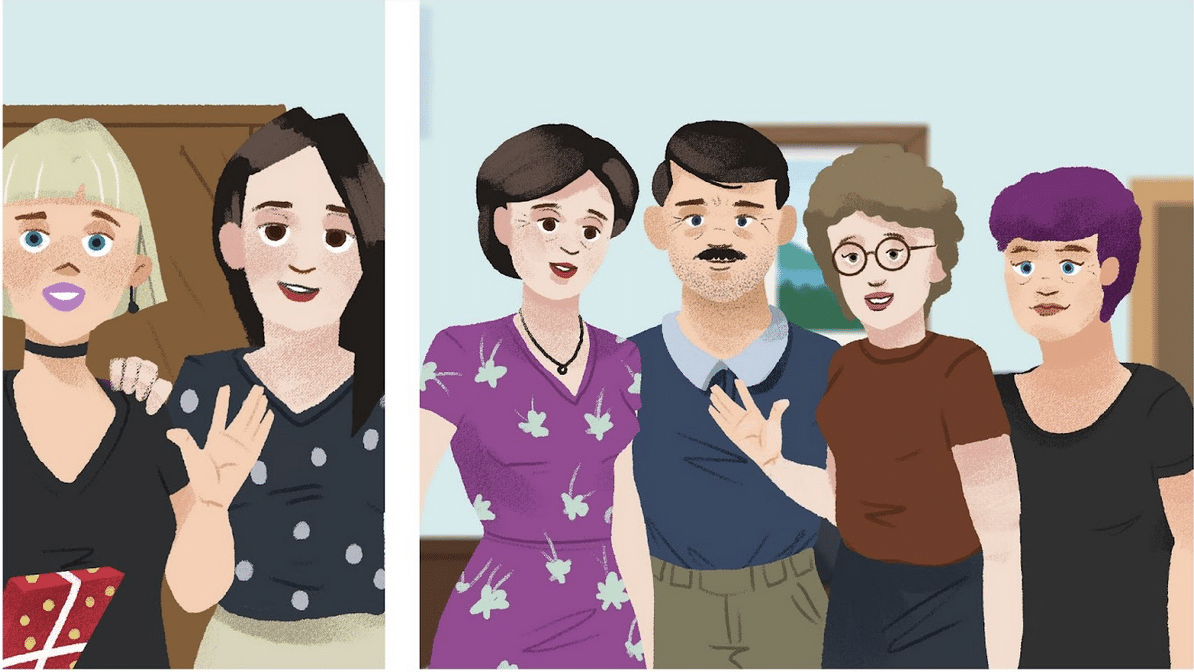 🔊 While you listen to dialogue two, look at Sandra’s family tree and complete the missing information. When you are done, talk with your classmate and take turns asking each other the question listed below. An example is provided for you. Not all names in Sandra’s family tree will be covered at this point. You can also download a fillable PDF.