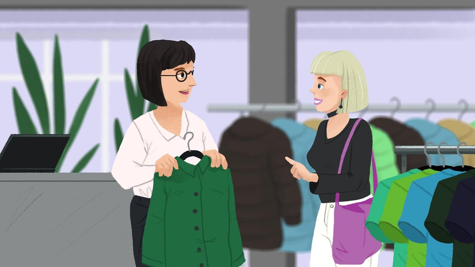 Prodavač | Naravno. Imamo velik izbor. Koju boju želite? |