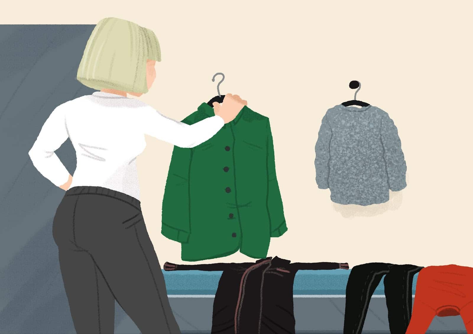 Laura | Ne volim sivu boju. Probat ću zelenu i crvenu. Gdje je kabina? |
