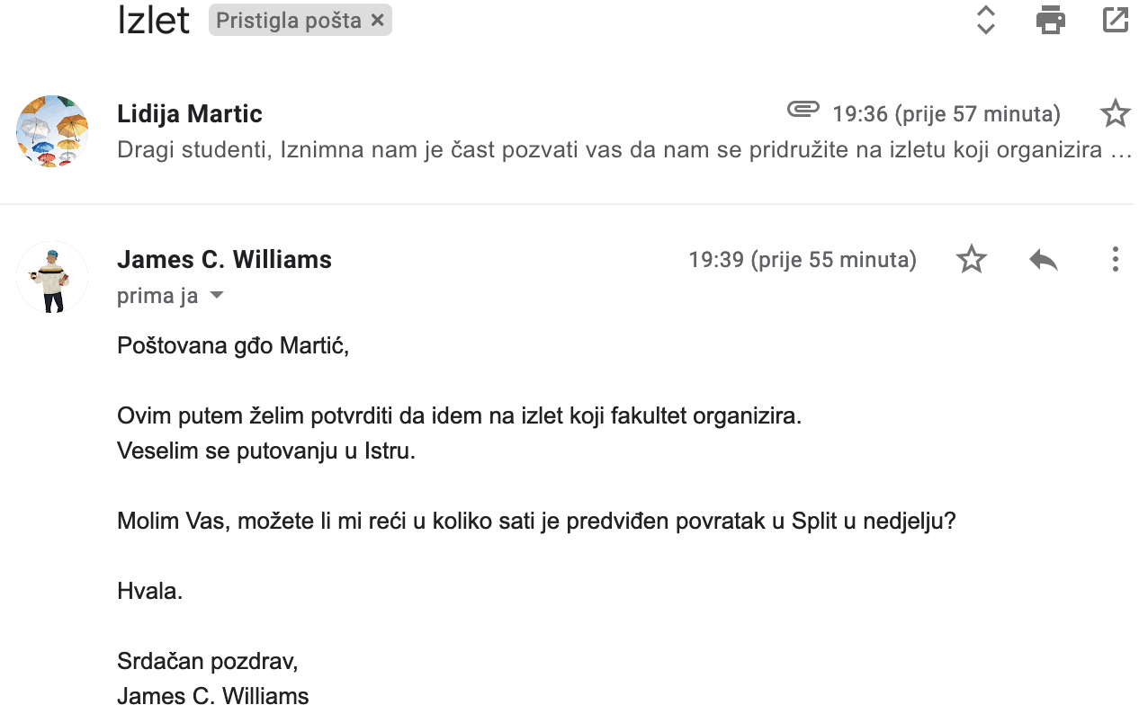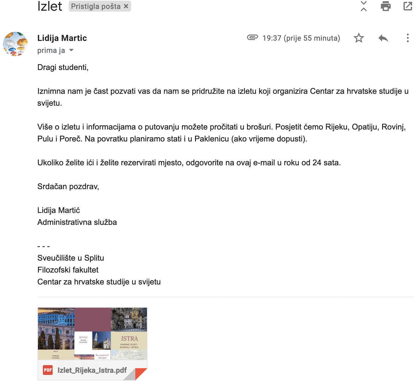 The Center for Croatian Studies Abroad (Centar za hrvatske studije u svijetu) where James is learning Croatian, is organizing a weekend trip for all of their international students. All local students who are helping international students assimilate upon their arrival, and who participate in extracurricular activities, also received an invitation to join. Read the email that James and his friends received from school.