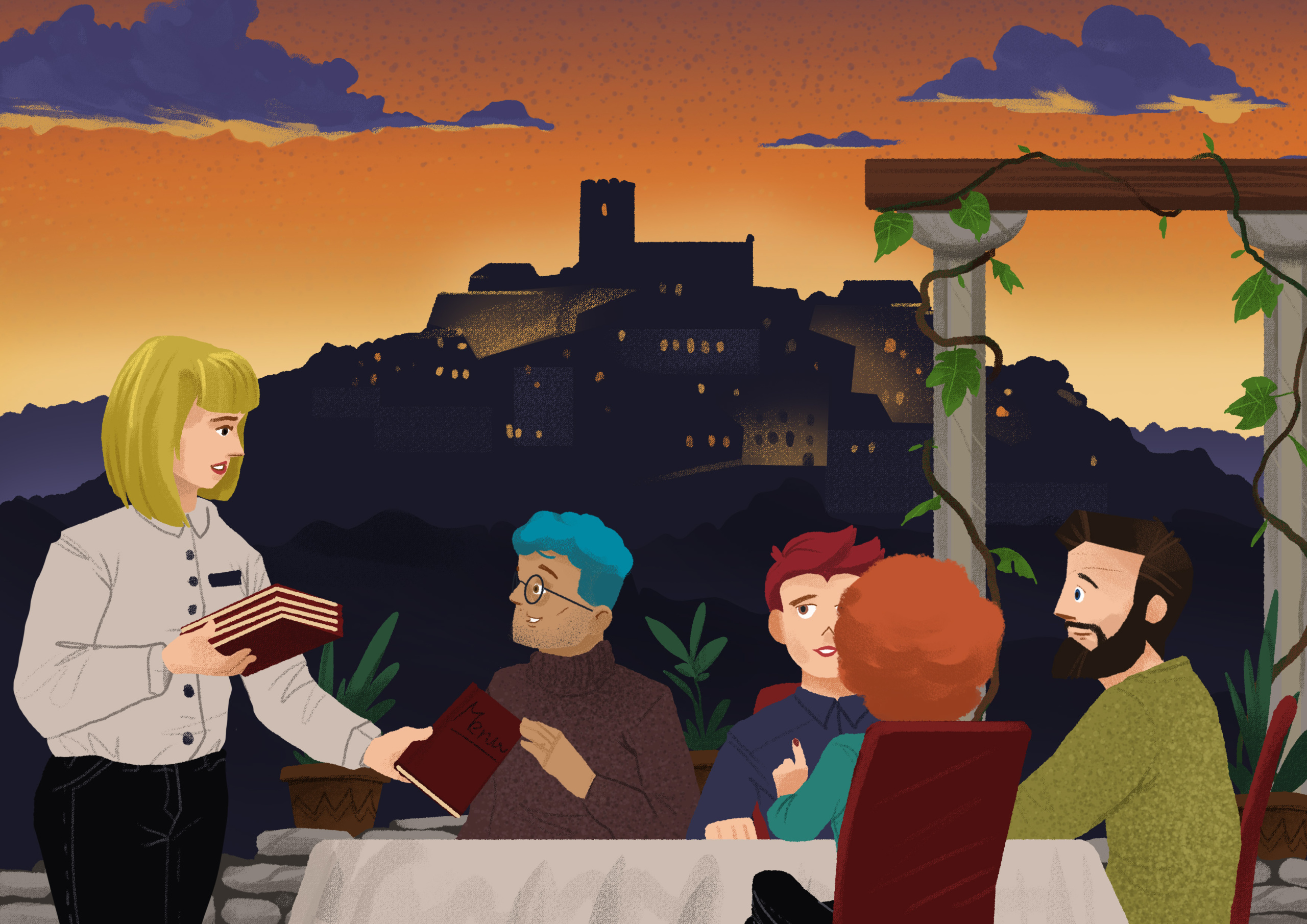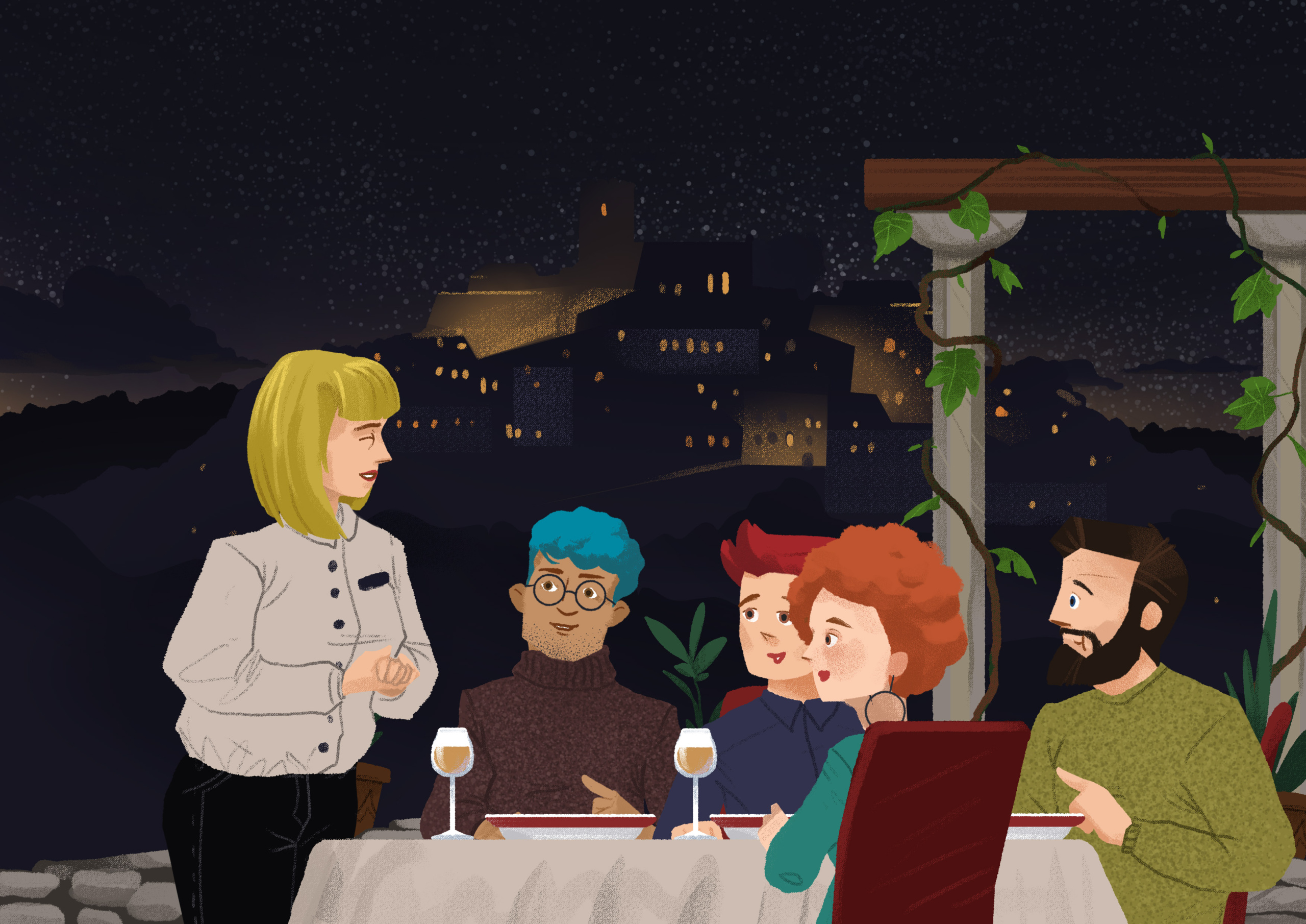 | Konobar: | Jeste li spremni i za glavno jelo ili trebate još vremena? |