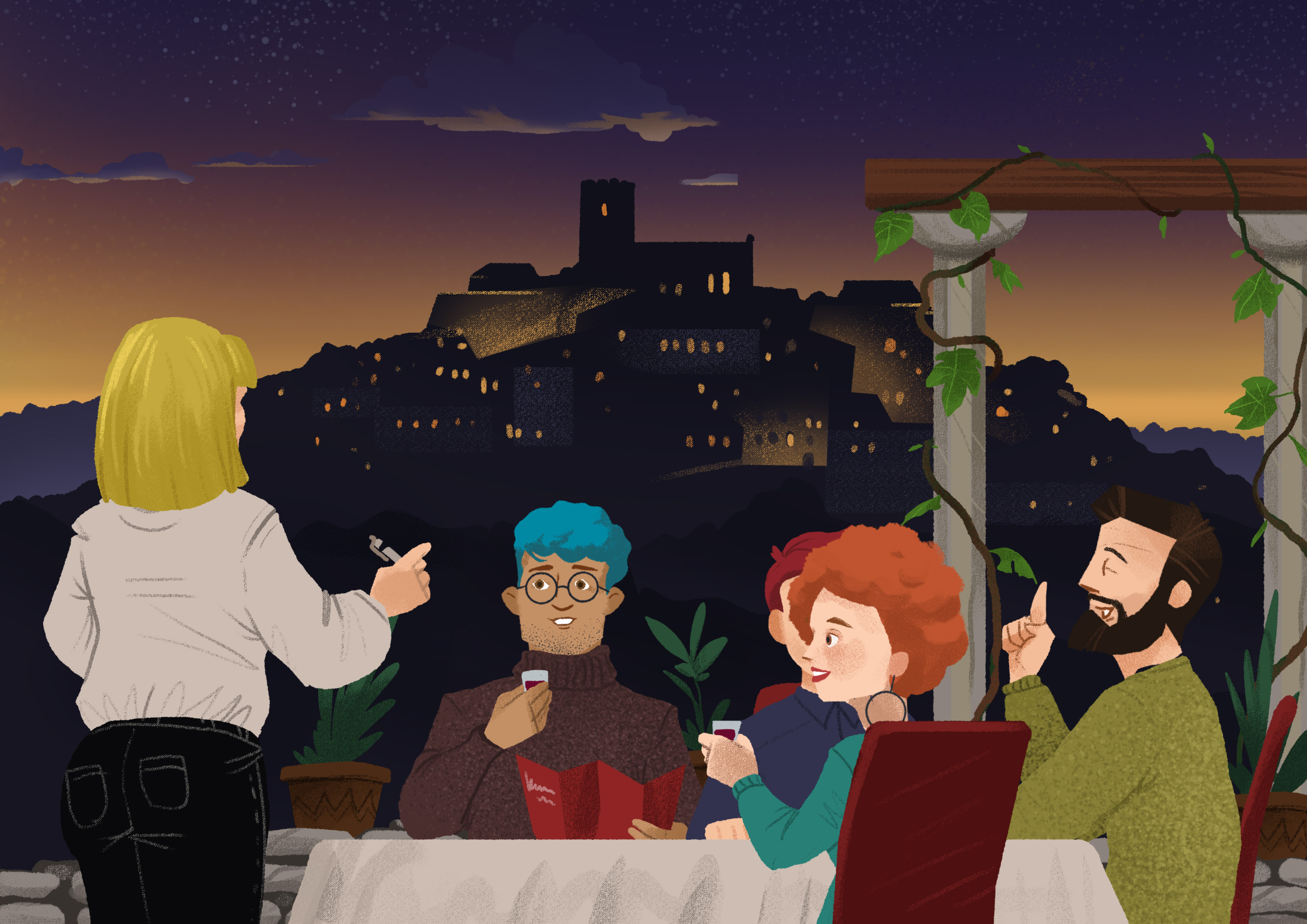| Konobar: | Izvolite vinsku kartu. A za Vas, medica. |
